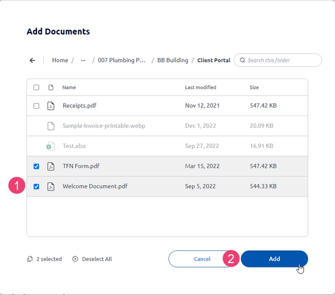 - Select any number of documents to add to the document pack and click Add