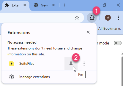 - Click on the extension's icon in the top right of the browser, then select the pin next to SuiteFiles