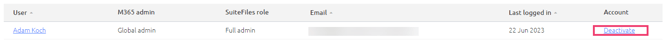 To deactivate a user, navigate to the Account column, and click Deactivate.